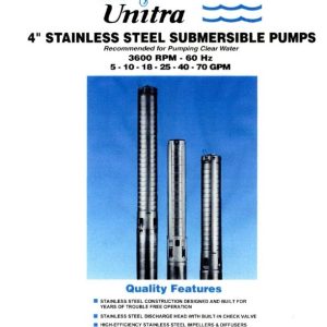 The SP Stainless Steel Series submersible pumps are manufactured by Unitra in the USA using high quality materials and are designed to deliver years of dependable service. Capable of 10 gpm from 300 ft using any 1hp 4” submersible motor. It has a 1 ¼” discharge 15 impeller stages.. (All Nema 4 submersible 4” diameter motors will fit this pump.)